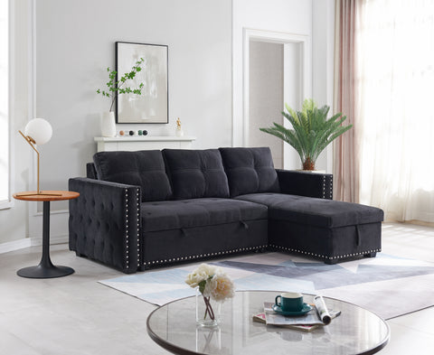 Sectional sofa with pulled out bed, 2 seats sofa and reversible chaise with storage, both hands with copper nail, BLACK, (91" x 64" x 37")