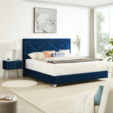 B109 King bed with one nightstand,Beautiful brass studs adorn the headboard, strong wooden slats + metal legs with Electroplate