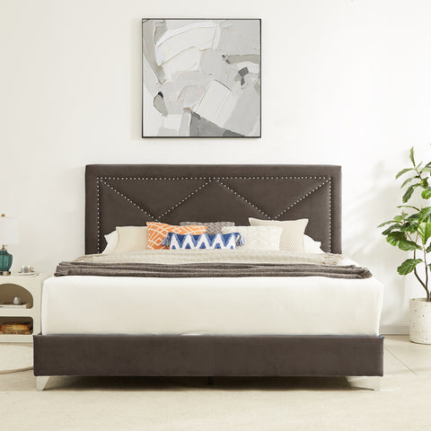 Velvet Upholstered Platform Bed Frame, The design of the beauty is generous, Wood Slat Support, No Box Spring Needed, Easy Assemble, King Size, Brown