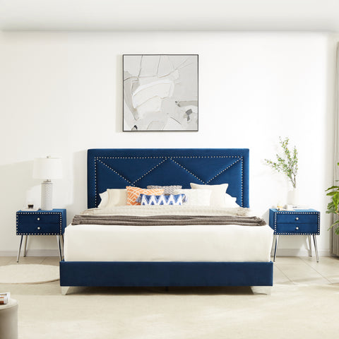 B109 King bed with two nightstands,Beautiful brass studs adorn the headboard, strong wooden slats + metal legs with Electroplate