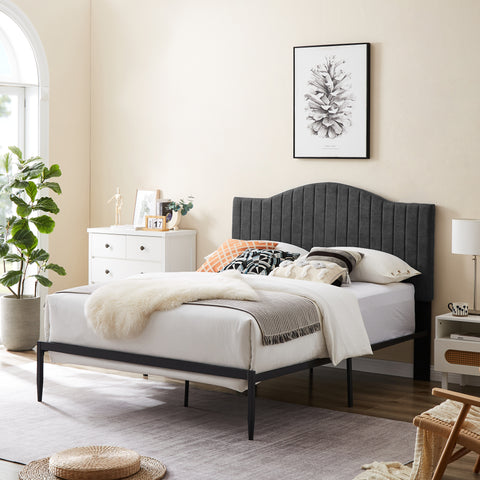 B100S Queen bed, Button designed Headboard, strong wooden slats + metal support feet, Gray Flannelette