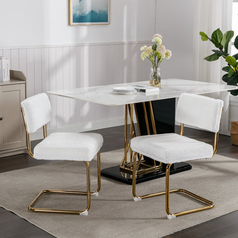 A&A Furniture,Modern Dining Chairs with Artificial Rabbit Hair,Gold Metal Base, Accent Armless Kitchen Chairs with Channel Tufting, Upholstered Fake Fur Fabric Side Chairs, Set of 2, White