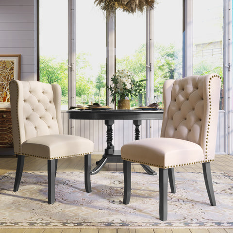 TREXM Cotton Fabric Dining Chairs Set of 2, Upholstered Dining Room Chairs with Solid Wood Legs, Wingback and Button Tufting (Beige)