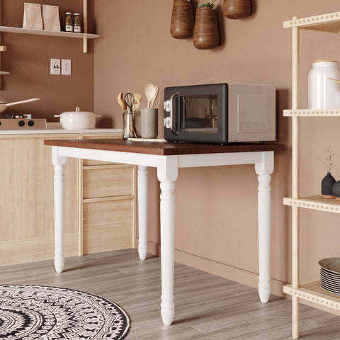 Built with solid rubber wood legs and MDF veneer for tops, this kitchen table is designed to last for years. The combination of a finished white wood frame and cherry coating is ideal for indoor farmhouse feelings.