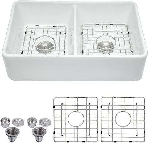 White in color, the kitchen sink is sharp, stylish, and features a convenient double-bowl design.Made of cast ceramic, the Farmhouse Sink is a durable addition to any home. The material's resistance to heat and scratches makes it perfect for a frequently used kitchen. Our products are inspired by vintage farmhouse sinks that create a distinctive clean look. It will not rust, fade, or discolor, providing beauty and durability.