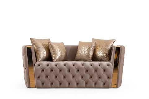 Your living room is the heart of your house, it’s a place for family entertainment/ family gatherings and where you can showcase your creativity to the world. With this state-of-the-art living room set, let us help you turn your living room into a luxurious and glamorous place that will center everyone's attention. This modern transitional design provides tremendous aesthetic versatility, ideal for your living room. The visual appeal of this charming modern sofa will grab you, but the cozy comfort will make you fall head over heels. First to catch your eye is the Fabric button-tufted velvet upholstery. The velvet fabric upholstery brings out this sofa's glamorous side, while exquisite details, including high-density foam fill with spring support and button-tufting, elevate the design. The slick arms round out this eye-catching design. The gold accents in the front make this living room set stand out. The gold accents with black/taupe make the bedroom soothing to look at. Multiple matching gold and black accent pillows accompany the whole set, adding glam and comfort to your sitting. This set is a lovely mixture of beauty and sturdy built that will last you years to come. Whether you're hosting a party or spending quality time with your family, this living room set will be the center of everything.