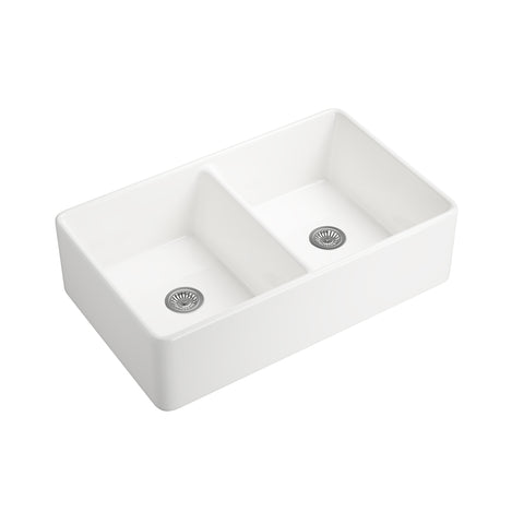 - Apron Front Kitchen Sink Single Bowl White Fireclay Porcelain Ceramic Farm Kitchen Sinks Superior Quality This white farmhouse kitchen sink constructed of true fireclay a special white clay that is fired at 2900 °F for extreme strength and durability. Durable ceramic construction with high temperature heat-treated vitreous glazed surface to resist stains and scratches. Ceramic is hardened with a lasting, high gloss glaze that prevents scratches and stains. Apron Front Kitchen Sink Unique drop-in