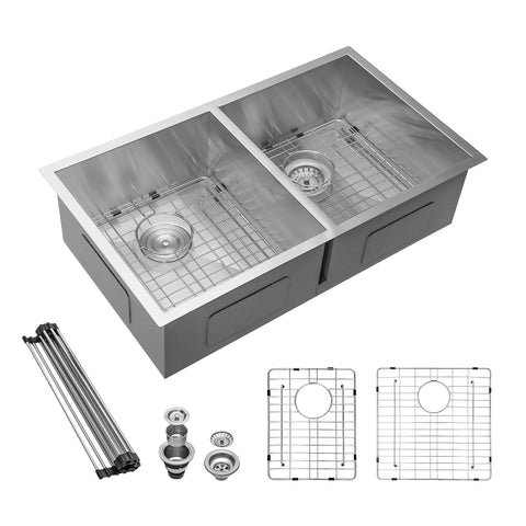 Sink Dimensions: 32" x 18" x 9", Bowl Depth: 8.75" ▏ (MINIMUM BASE CABINET SIZE: 35 inches, Please confirm the size of your home cabinet and choose the correct sink size to purchase); Right bowl inner size: 14.5" x 16 " x 8.75"; Left bowl inner size: 14.5" x 16" x 8.75". Standard 3.5" drain opening will fit any garbage disposal unit.