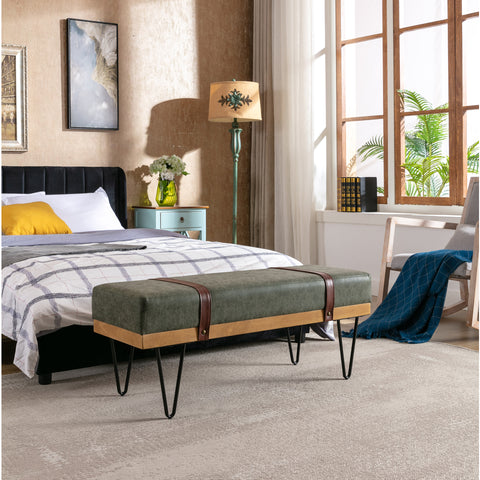 Faux leather soft cushion Upholstered solid wood frame Rectangle bed bench with powder coating metal legs ,Entryway footstool