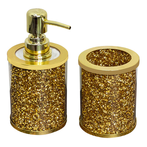 Ambrose exquisite 2 piece soap dispenser and toothbrush holder in elegant gift box. This set features crushed diamond glass in gold with chrome accents. Soap dispenser: 3.25 In. D and x 6.5 In. H.; Toothbrush Holder: 3.25 In. D x 4 In. H. Bring a stylish touch to any home with this functional piece and decorative accent. Cleaning Instructions: Wipe with damp cloth or non-abrasive cleaner. 90 Day Manufacturer Warranty.Vision
