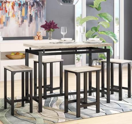 Gather friends around for craft beer flights or simply take in a quick morning meal with this five-piece pub table set, perfect for casual occasions. Crafted from manufactured wood, this set is ideal for industrial and contemporary settings with its clean lines and neutral solid finishes. Each backless stool is founded atop four legs connected by supports, able to hold up to 250 lbs. each. Some assembly is required for this product.