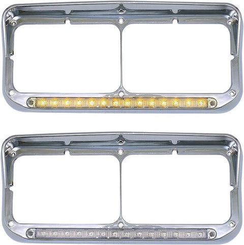 Chrome Plastic Dual Rectangular Headlight Bezel With Visor for Kenworth T400 T600 T800 W900B W900L Peterbilt 378 Western Star 4900 Trucks (Amber LED with Clear Lens)