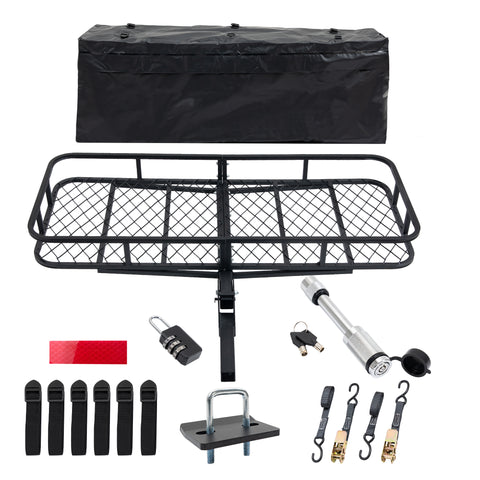 • [Accessory Included]Includes a waterproof hitch rack cargo bag that is approximately 51" L X 16.5" W X 18" H giving you a capacity of around 8.8 cubic feet. Also included a Hitch Stabilizer for Reduce noise and movement while driving and 2 rainproof ratchet straps for secure cargo in basket, ensure your belongings are securely transported.