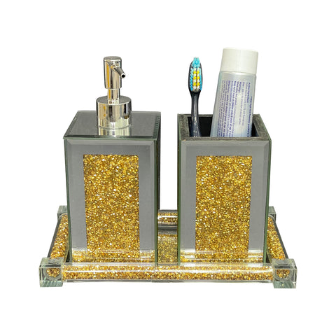 Ambrose exquisite 2 piece square soap dispenser and toothbrush holder in elegant gift box. This set features gold crushed diamond glass with chrome accents. Soap Dispenser: 3.25 In. L x 3.25 In. W x 7.5 In. H; Toothbrush Holder: 3.25 In. L x 3.25 In. W x 5.5 In. H; Tray: 9 In. L x 5.5 In. W x 2 In. H. Bring a stylish touch to any home with this functional piece and decorative accent. Cleaning Instructions: Wipe with damp cloth or non-abrasive cleaner. 90 Day Manufacturer Warranty.Vision