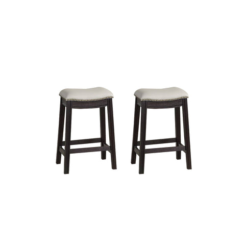 Up top, the ergonomic saddle seat is vintage nailhead trim, pluses feet pedals for much comfort. The perfect pick for any modern farmhouse-inspired space. The stool features faux leather upholstery, it seat padded with high-density foam to keep you comfy all day long. Sold in a convenient set of two. Seat Height: 24 inches.
