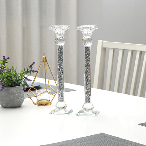 Bring an elegant touch to any tabletop with this beautiful, crystal embellished, decorative candlestick holder set of 2. Made of crushed diamond glass, this luxury accent is suitable for any home, office, or occasion. Each candlestick holder measures 3" L X 6" W X 12.25" H and fits 3/4" taper candles. Candles not included. Cleaning Instructions: Wipe with damp cloth or non-abrasive cleaner. 90 Day Limited Manufacturer Warranty.Vision