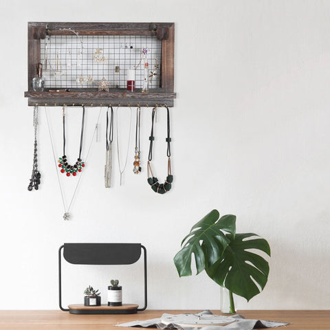 Wall Mounted Wooden Holder Hanging Jewelry Organizer with a Removable Bar, a Shelf and 15 Hooks, Rustic Brown