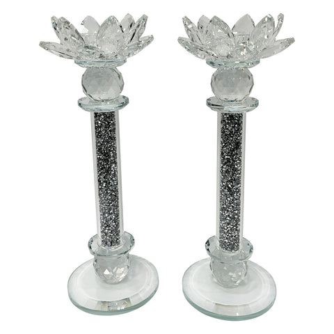Bring an elegant touch to any tabletop with this beautiful, crystal embellished, decorative candlestick holder set of 2. Made of silver crushed diamond glass, this luxury accent is suitable for any home, office, or occasion. Each candlestick holder measures 4" L x 4" W X 11.5" H and fits 1.25" taper candles. Candles not included. Cleaning Instructions: Wipe with damp cloth or non-abrasive cleaner. 90 Day Limited Manufacturer Warranty.Vision