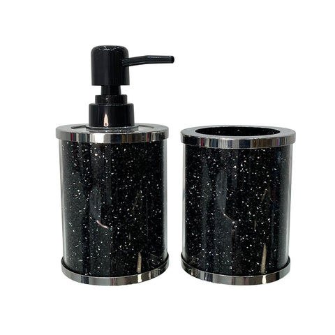 Ambrose exquisite 2 piece soap dispenser and toothbrush holder in elegant gift box. This set features crushed diamond glass in black with chrome accents. Soap dispenser: 3.25 In. D and x 6.5 In. H.; Toothbrush Holder: 3.25 In. D x 4 In. H. Bring a stylish touch to any home with this functional piece and decorative accent. Cleaning Instructions: Wipe with damp cloth or non-abrasive cleaner. 90 Day Manufacturer Warranty.Vision