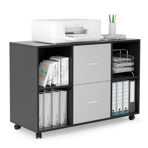Mobile wood filing cabinet with 2 drawers and 4 open storage cabinets and wheels for home office, black oak light grey