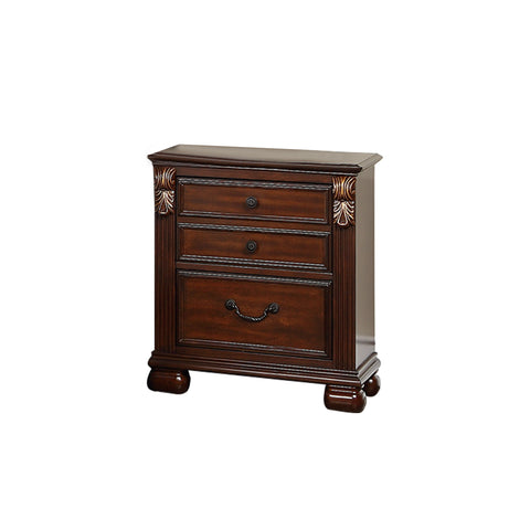 Enhance your bedroom's natural style with this lovely wooden nightstand. Its three roomy drawers provide spacious space while adding a touch of glamour. Its deep, rich, cherry finish is accentuated by gleaming, dark metal bar handles. Place a reading lamp on top to illuminate your surroundings as you settle in for the evening. This nightstand is an excellent choice to finish off the decor of a guest or master bedroom.