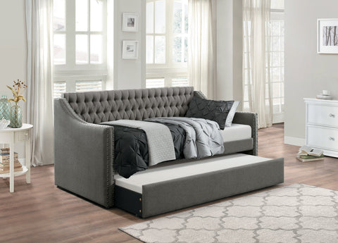 PRODUCT FEATURES: - • Country of Origin: Malaysia • Wood and engineered wood frame • Fabric upholstery • Button-tufted detail • Nailhead trim • Pull-out trundle bed with casters • Foundation/box spring not required • Recommend to use twin mattress no thicker than 8 inches for bottom trundle unit • Fabric Color: Dark gray • Fabric Content: 100% polyester • Fabric Cleaning Code: Upholstery (S) PRODUCT DESCRIPTION: - The Tulney Collection is designed with the modern traditional home in mind. Designed to use as a bed or a cozy relaxation nook, it features a trundle that provides the extra space that you need for overnight guests. The day bed is covered in dark gray fabric. The button-tufted back panel and nailhead accent along the curved arm panels complete the traditional look. Also available in brown fabric. PRODUCT DIMENSIONS: - Overall Dimension: Daybed: 84" x 44.5" x 41.5"H, Trundle: 75.75" x 40.5" x 11.75"H Listing Includes: - One DayBed with Trundle Only. Assembly Required. Shipment Service: Shipping Service Include Curb Side Delivery with Free Lift Gate Service. NOTE: No Inside Home Delivery.Vision