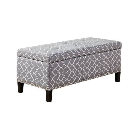 This modern storage ottoman accentuated with button tufting provides ample storage and features an elegant grey fretwork fabric with black noir legs. Assembly required.